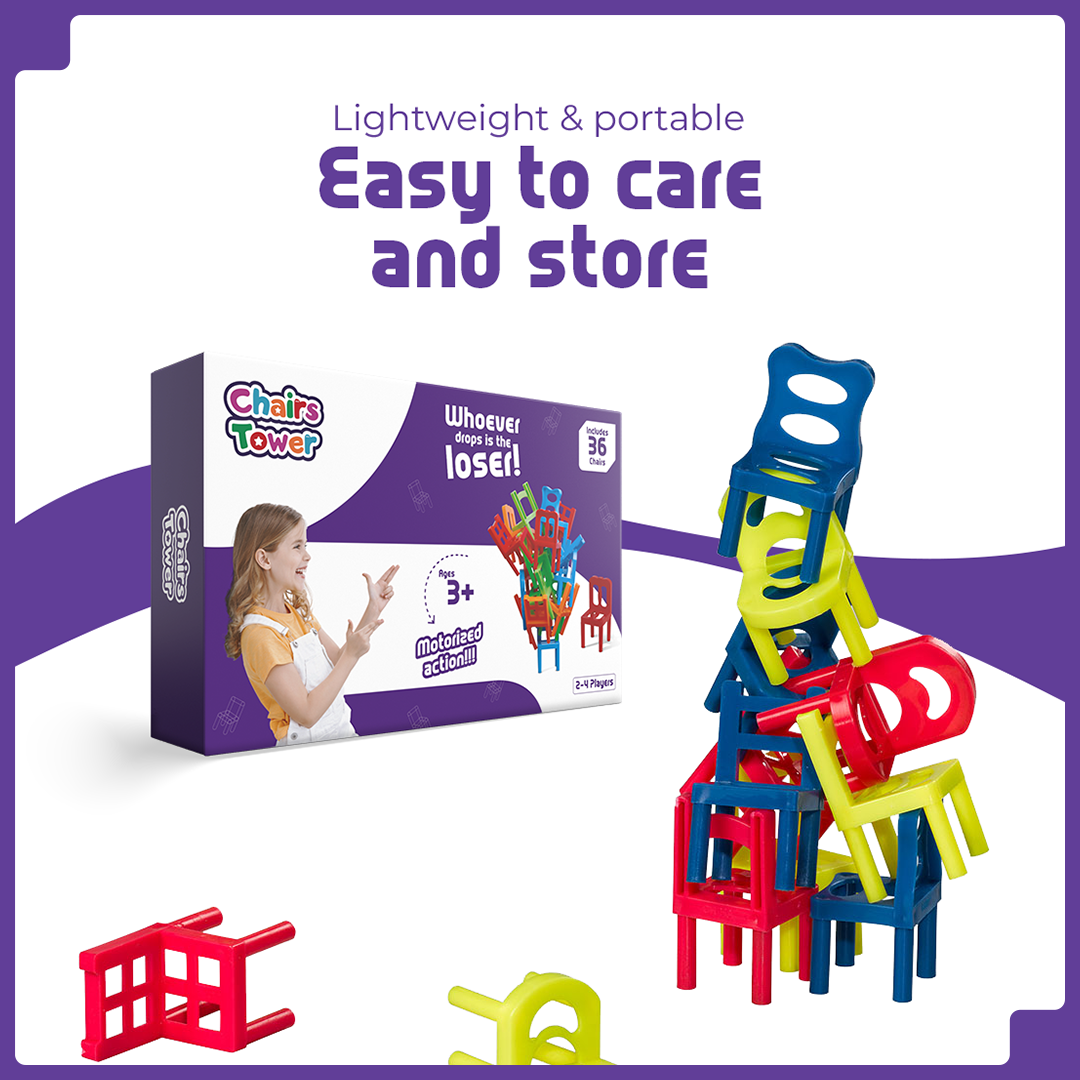 With Chairs Stacking Tower Balancing Game™, classic tower play takes a fun new form. This exciting balancing game uses 36 mini colorful chairs to spark creativity, strategic thinking, and family fun.