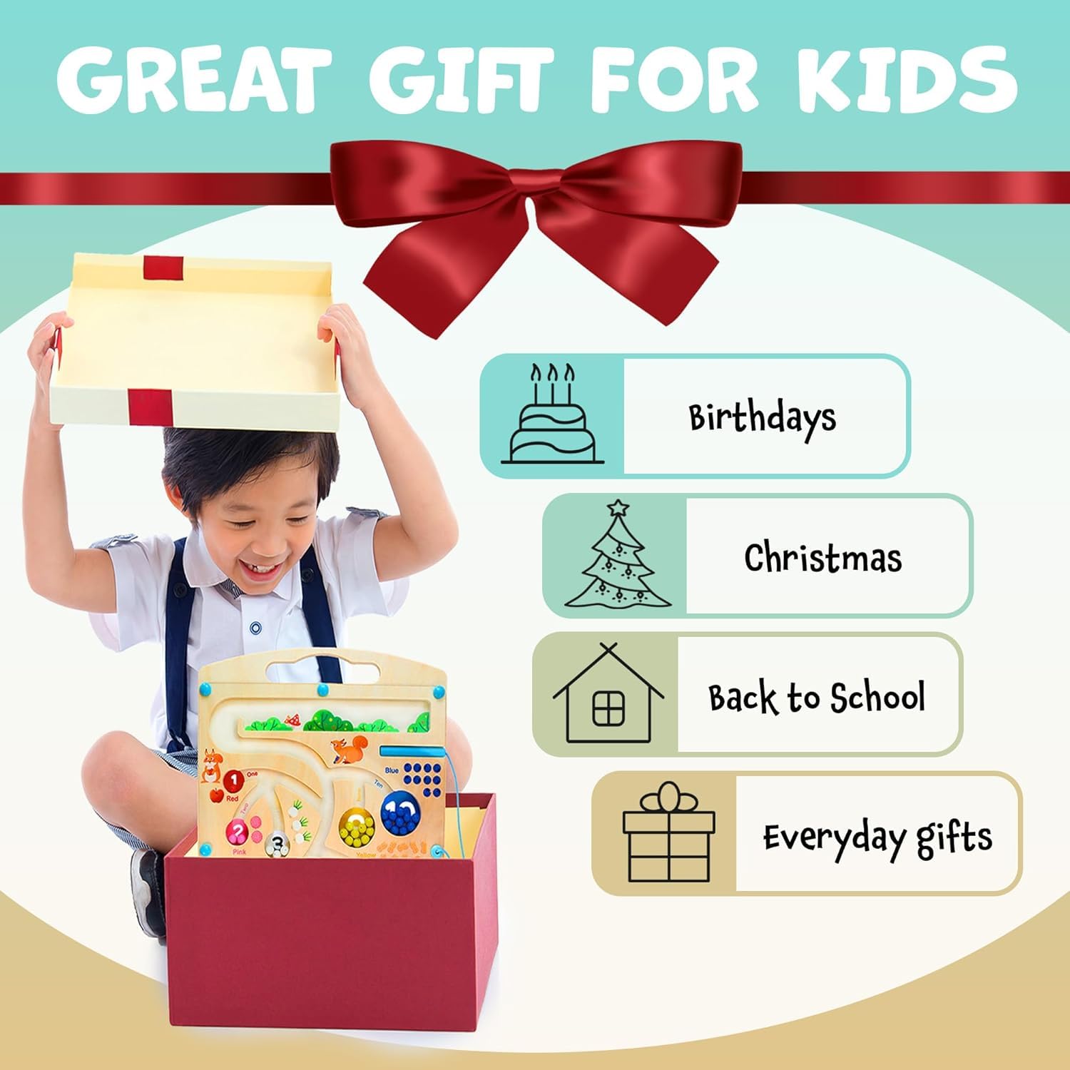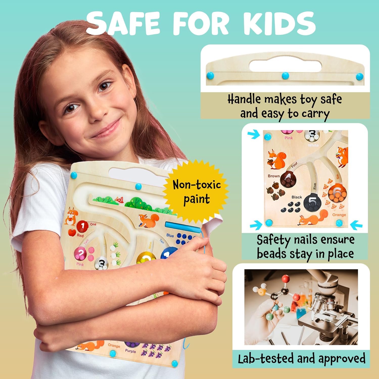 SquirrelQuest™ invites toddlers to guide tiny beads through a bright squirrel themed maze using a magnetic pen. As they move beads to match numbers and colors children naturally build focus logic and control. The sealed wooden board keeps everything secure making play smooth safe and mess free.